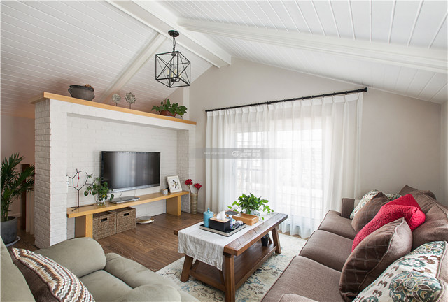 斜頂的設計營造美式鄉村的樸實、自然的氛圍。沒有濃墨重彩,但又淡雅的恰到好處。美式崇尚熱愛自由,電視背景墻張揚野性的設計,注重突出原始建材的質感,看似粗狂,實則和諧有個性。