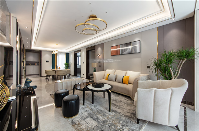 吊頂增加金色線條,隨處可見的輕奢感,豐富的材質(zhì)讓屋子變得富有內(nèi)涵、有韻味。