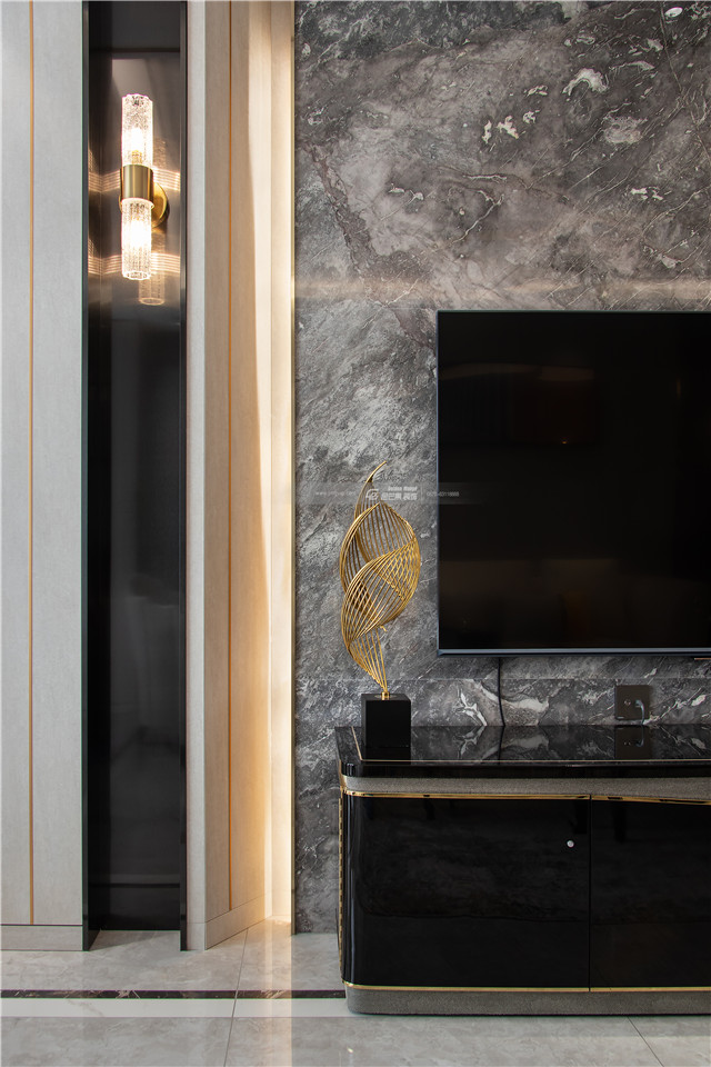 大理石電視背景墻結合兩邊的燈帶,營造輕奢的品質(zhì)感,讓背景墻層次更豐富。