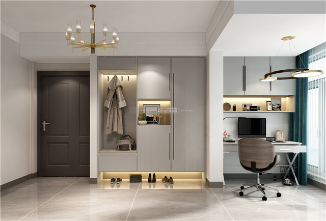 入戶設置卡座和玄關柜,方便收納,進出之間更方便。相鄰辦公區域,即可辦公亦可休閑,讓家居更加多變,功能性更強,品質更加提升。