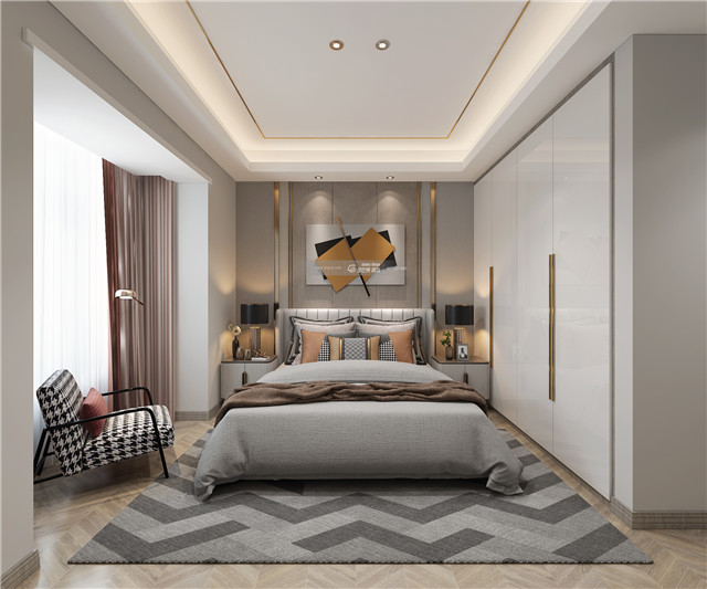 金屬線條營造輕奢氛圍,床頭精致的裝飾畫讓空間更加豐富有層次,千鳥格單椅增加文藝氣息。