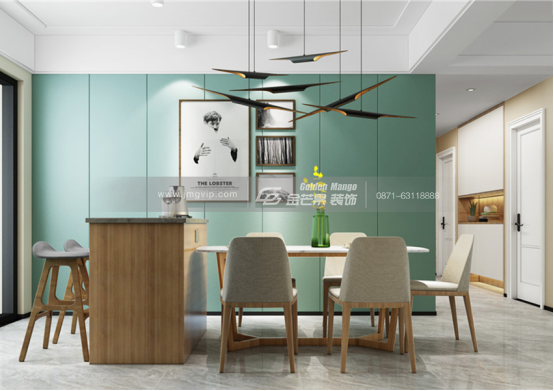 餐廳背景墻和吊燈都是同客廳的來做,在餐廳布局方面融入了吧臺設(shè)計(jì),致使空間功能上使用率更高。