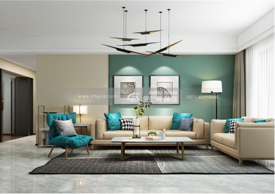 客廳整個空間主要以電視背景墻與沙發(fā)背景墻的顏色相呼應(yīng),獨(dú)特的吊燈設(shè)計(jì)有著很強(qiáng)空間穿透力,以及簡單的沙發(fā)和茶幾布置,再加上使用淺灰色的地磚,使得整個空間的色彩搭配達(dá)到極致,提升整個客廳空間的顏值。