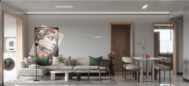 灰色和黑色搭配的顏色顯得冷硬而富有格調,弧形的設計和木飾面增加溫暖感。空間的設計上富有設計造型感。裝飾畫和整體營造冷酷有格調而又不失溫度的空間感受。
