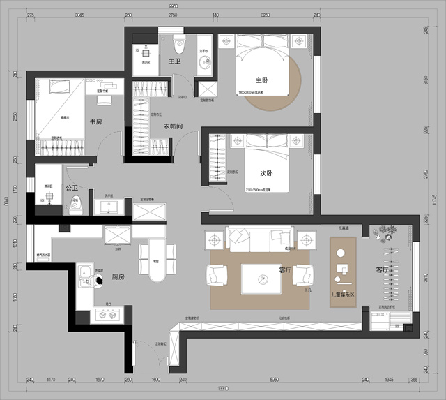 在整體風(fēng)格走向上,加入穩(wěn)重的灰色,不同深淺不同材質(zhì),既有碰撞區(qū)分又協(xié)調(diào)統(tǒng)一,空間感更好。
