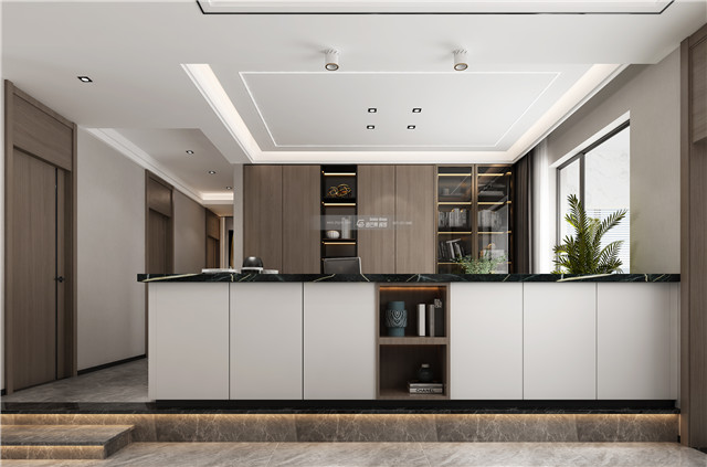 辦公休閑區(qū)設(shè)置臺面,既可以作為桌子、吧臺,又可作為餐邊柜兼具儲物功能,同時起到隔斷的作用,美觀和實用兼具。