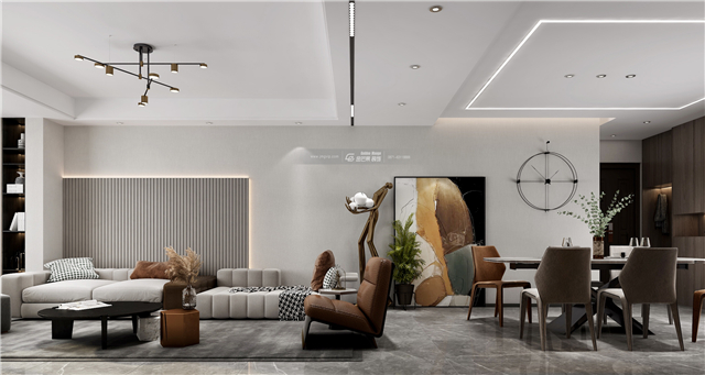 開放式客餐廳帶來良好的氛圍感,讓空間互動性更強。經典的顏色玩轉高級黑白灰,融入金屬元素和有質感、有儀式感的家具增加空間輕奢感。亮色的裝飾畫讓空間變得活潑起來。