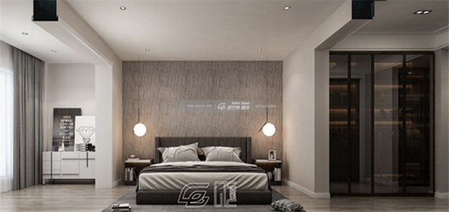 較為柔和的臥室床頭用兩個吊燈為主,打造安靜、溫和的個人空間。沒有過多的裝潢和飾品,少了艷麗色彩,多的是樸素、簡約。