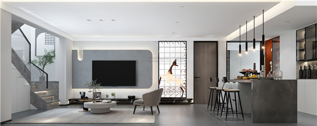 灰色電視背景墻搭配圓弧的造型,高冷中不乏溫柔的情調。清透的樓梯和玻璃和旁邊吧臺的情調形成鮮明的對比,展現冰與火的空間碰撞,空間變得多變起來。電視背景墻旁邊的亮色材質,讓空間變得亮眼了起來。