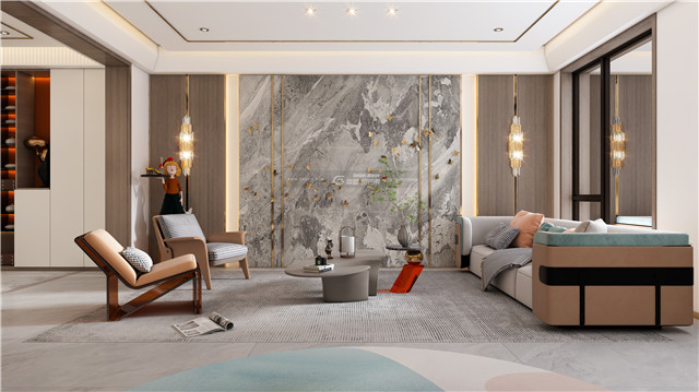 背景墻用大理石打底,加上一些金屬的線條和裝飾物,空間就變得具有輕奢氣息起來。兩邊華麗的燈飾折射出精致的光線,空間變得閃耀,暖橘色的單椅和點綴橘色、青色的沙發(fā),讓空間多了一些溫馨的韻味,空間更加多變。
