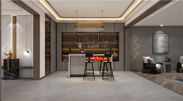 酒吧區(qū)運用金屬線條、灰玻,讓空間充滿格調(diào)感。典雅的柜子和吧臺結合,中西碰撞韻味盡顯。在吧臺上安裝電子壁爐,喝上幾杯清酒,身心都是暖暖的。