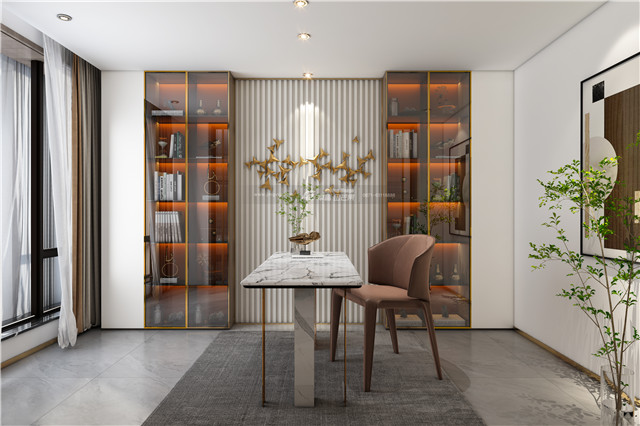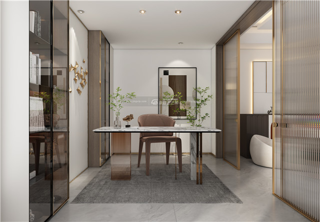 運用的是相對清新的顏色,簡潔的大理石書桌,灰粉色辦公椅,精細的線條,讓空間變得精致韻味十足。灰玻和長虹玻璃,營造隱約的光影效果,高級感滿溢。