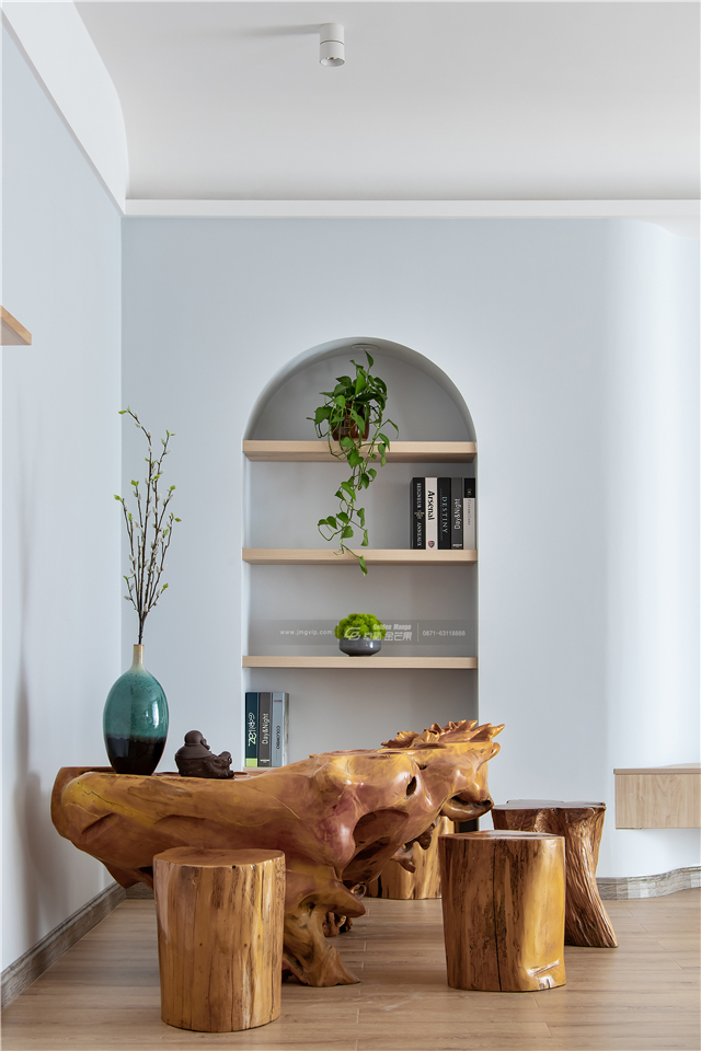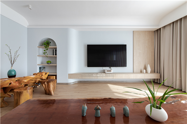 電視背景墻旁的壁龕設計,點綴幾株清新的綠植,有弧度的墻面,曲折流轉間,仿佛走進了森林里的小路,清新而充滿趣味。