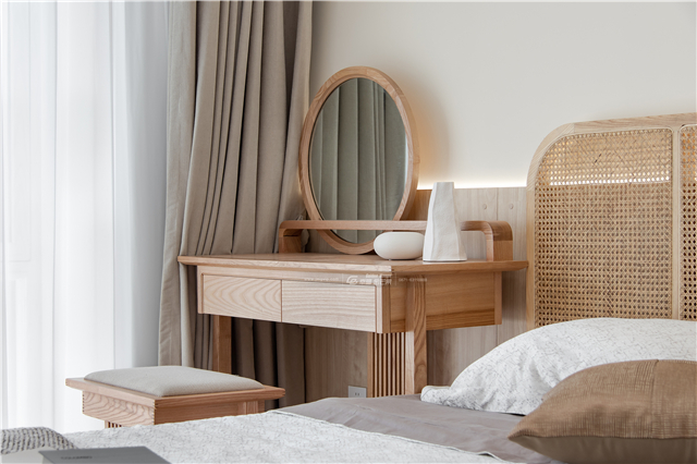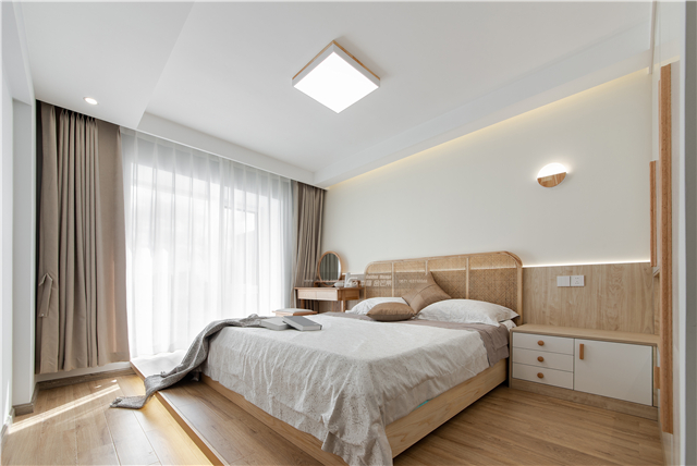 純白的紗簾是原木家具的絕佳伴侶,陽光透過一片純白在木地板上投下斑駁的影子,暖融融輕飄飄,身心都變得慵懶而輕盈起來。