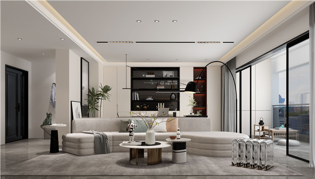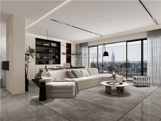 不規則沙發,突破空間的桎梏,讓空間變得更加靈動。彰顯自由和自在。 整體潔凈、利落的白色調,心情也變得干凈、簡單起來,放下嘈雜,放松身心。寬大的落地窗,空間變得更加通透。窗外繁花似錦,窗內舒逸生活。