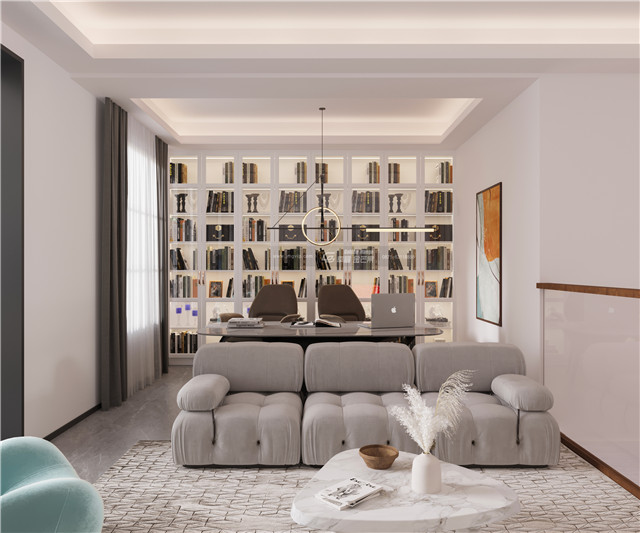 客廳設(shè)計開放式書房,一整面玻璃柜體既作為電視背景墻,有兼具強(qiáng)大的收納功能,放置書房的書籍,整體空間大氣而個性十足。