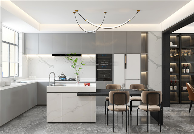 中西廚結合的超大廚房,滿足精致生活的物質準備。吊柜和櫥柜增加大量的儲物功能。精致的餐桌下品嘗一頓精致的餐食,生活優雅又安逸。