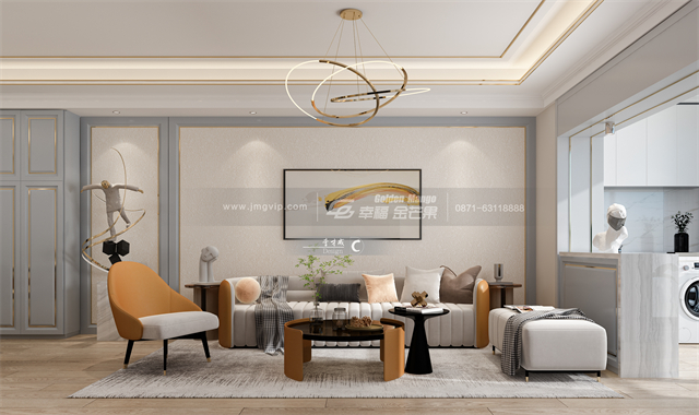 浪漫邂逅開場,如同故事的序章。整個客廳空間,藍色+白色的主旋律,細膩溫潤的色澤在低灰度與飽和度的色覺暈染下呈現著優雅脫俗的超凡氣質。灰藍色背景線條調性低奢,灰色沙發融合橘色點綴,演繹出一種“低調的奢華”,令空間質感更為飽滿。