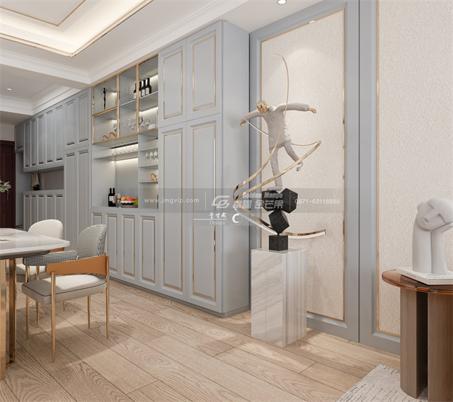 鑒于客戶對歐式輕奢美學的欣賞,在室內的設計上,設計師李才成老師摒棄了傳統歐式的繁復和冗雜,進行了一次美學上的優化升級。賦予空間素雅澄凈、奢于自然的藝術內核,通過定制化的設計讓生活的詩意萬象浸潤于點滴日常。
