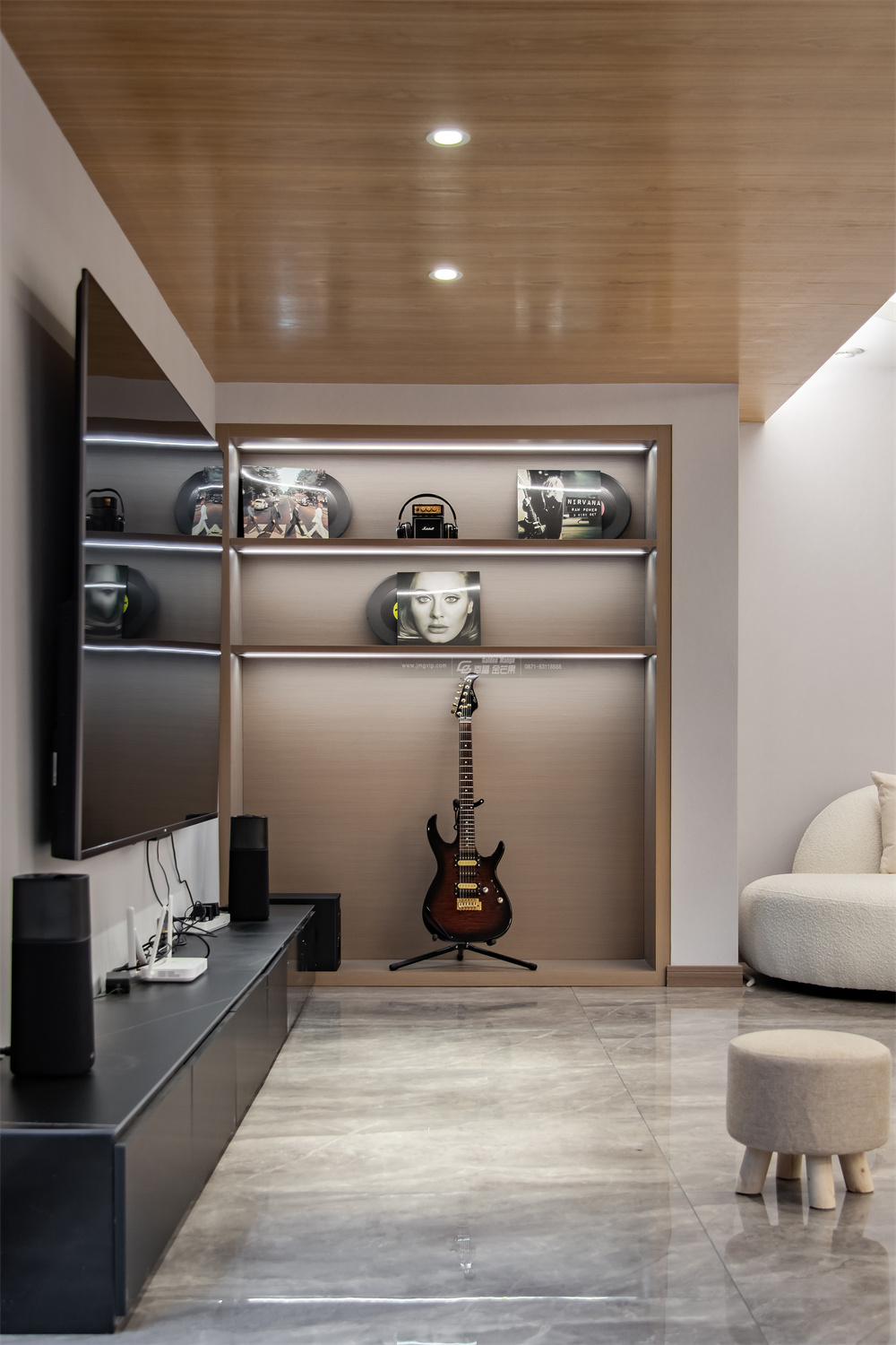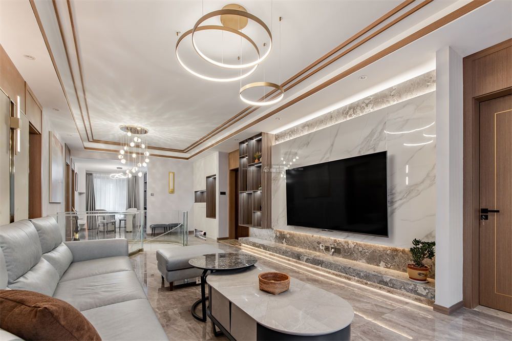 摒棄傳統(tǒng)的電視柜造型,用大理石加燈帶的處理,護墻板后安裝燈帶,相互輝映打造優(yōu)美的光影效果。是打動人心的溫暖,是別具一格的華麗。