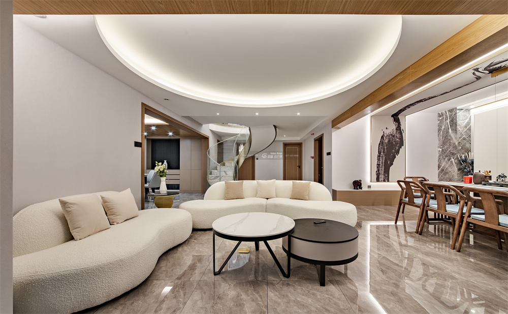 清透自在,有如山風過境,洋溢著自然的清新與生命力,視覺營造通透,擴大居者視覺感官與心境體驗。圓形的吊頂有如蒼穹,容納下萬物景觀,訴說著整個空間的靈動與自在。