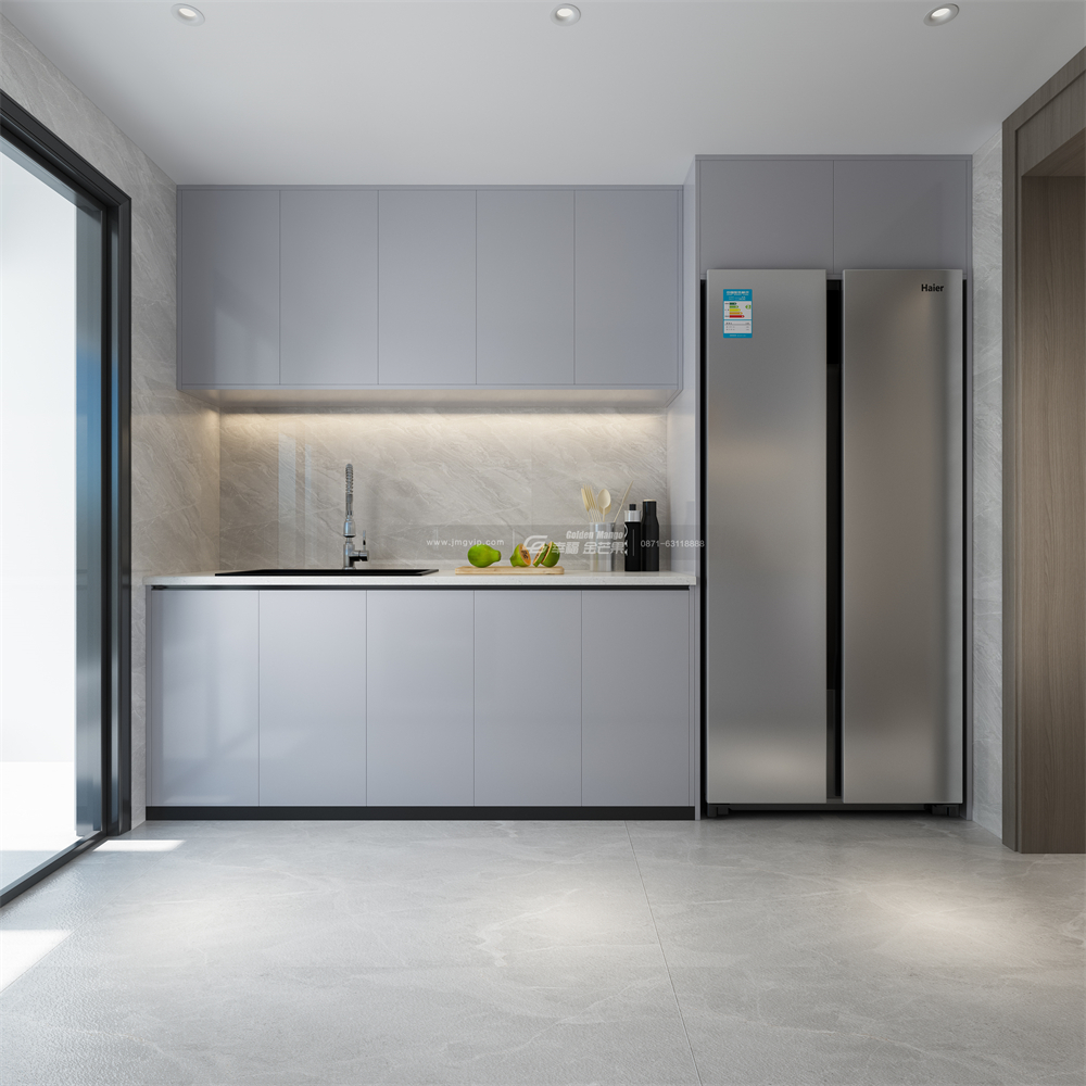 廚房的色彩搭配不宜太過鮮艷,選用低飽和度的灰色系,看上去會更清爽柔和,減輕廚房油煙感!