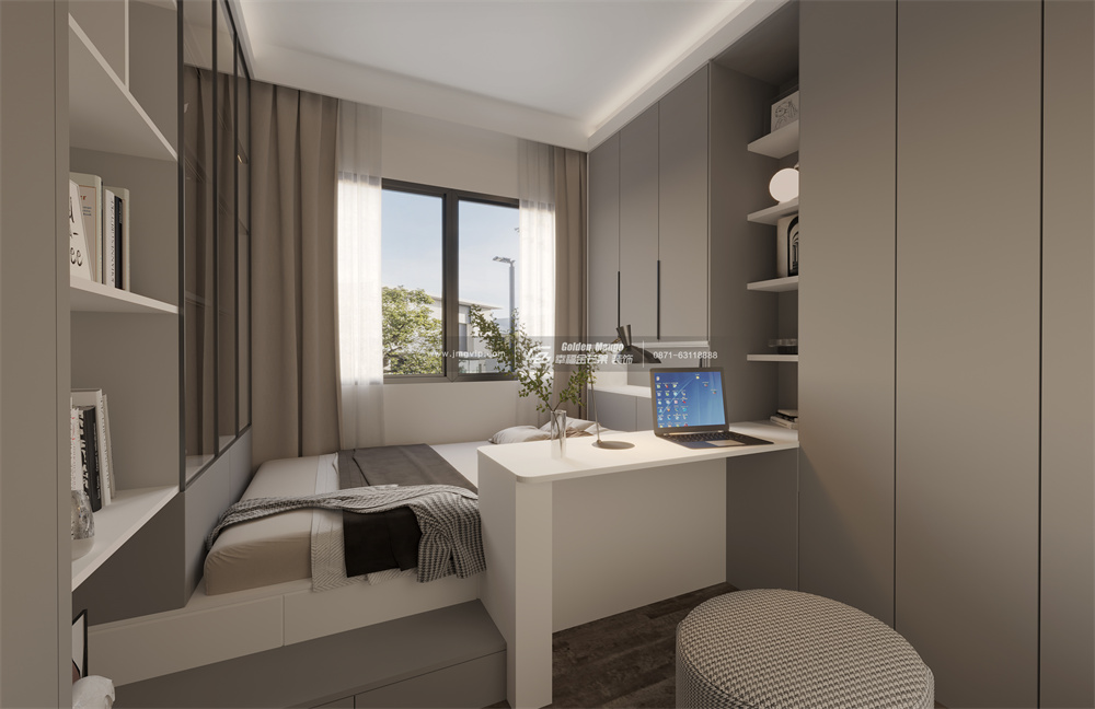 書房色調(diào)偏沉穩(wěn),辦公桌正對窗臺,視野開闊,辦公之余也能放松眼睛;榻榻米的設(shè)計使書房兼具客臥的功能,也可以當(dāng)做午后小憩的地方,空間得到最大化利用。