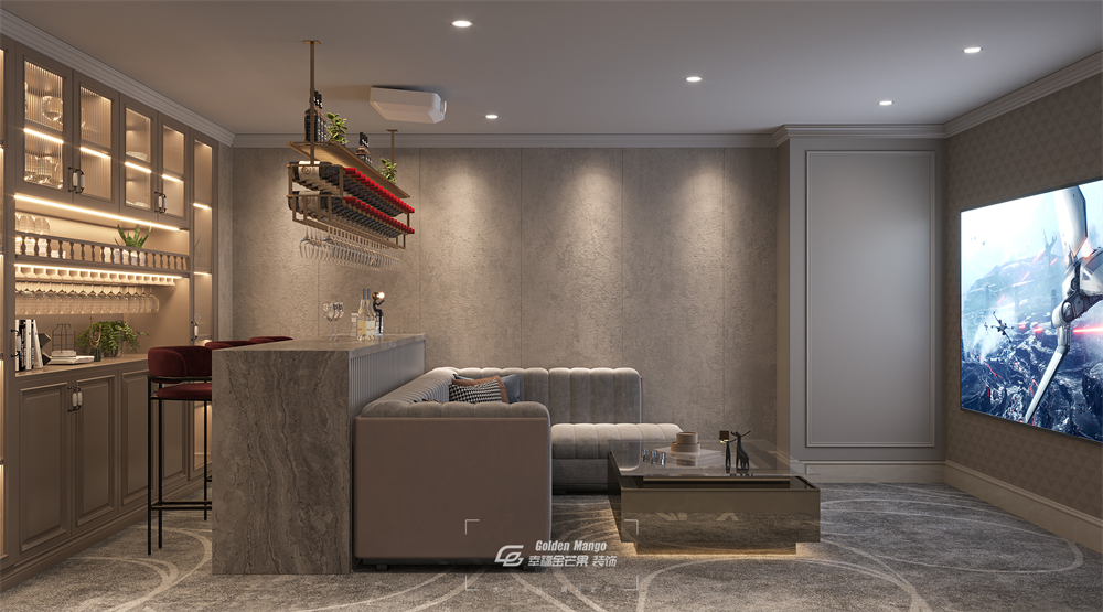 壁燈照著吧臺,紅酒靜靜躺在架子上,綠植的點綴撫平了烈酒入喉的灼燒。在溫馨柔和中,氣息突然曖昧起來。暖黃色的燈光嵌入了柜子,流淌過透明的杯壁,撫摸著酒杯上的花紋。
