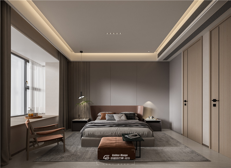 忙碌是生活的常態(tài),選擇安放精致讓自己鮮活起來。床尾的衣柜以虛實結合的體塊感呈現出來,相異的色調在其間碰撞交錯,演繹靈動隨性之美。