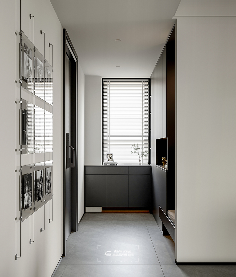 另一側(cè)的黑色柜體和照片墻形成強(qiáng)烈對比,簡約又大氣。地面的淺灰色地磚一路鋪開,從玄關(guān)延伸到室內(nèi),視覺上直接把空間拉大了好幾倍,看著就敞亮。