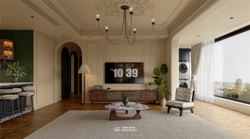 整體以柔和米色為主色調,搭配雕花吊頂、石膏線護墻勾勒優雅輪廓,拱門設計增添浪漫韻味。開放式布局串聯起客廳與休閑吧臺,復古吊燈、木質電視柜、花紋單人椅等家具,融合經典元素,大理石茶幾與綠植點綴提升精致感。大面積落地窗引入充足光線,延伸空間同時借景窗外,營造出兼具優雅懷舊與舒適愜意的居住氛圍 。