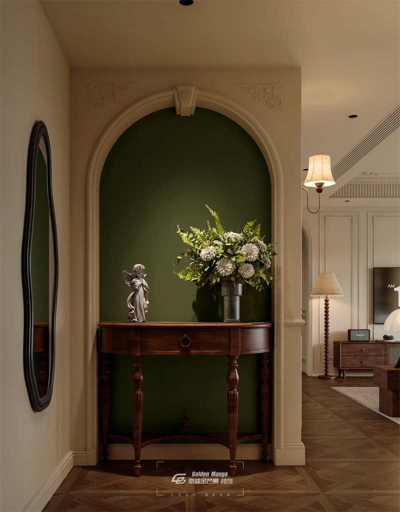 以米色墻面搭配墨綠色背景墻,營造優雅氛圍。拱形門洞、雕花裝飾融入經典元素,木質半圓玄關桌實用美觀,天使雕塑與花藝點綴增添浪漫精致感,側邊異形鏡豐富層次,整體呈現出兼具儀式感與藝術氛圍的過渡空間 。