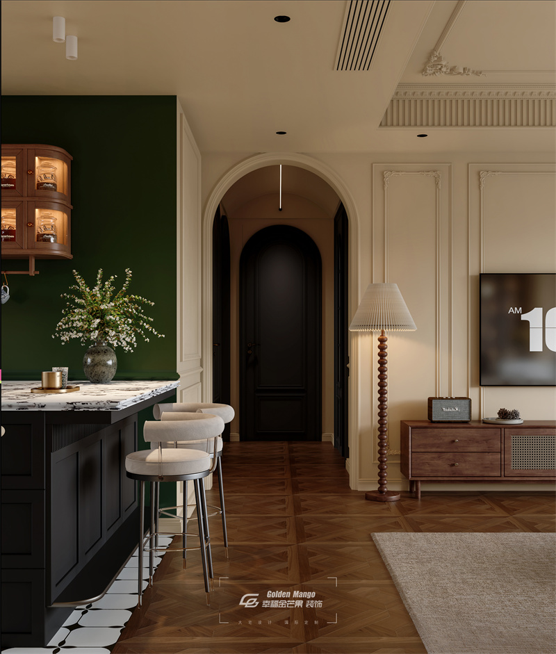 柔和米色鋪陳空間基底,一側墨綠色墻面跳脫又和諧。拱門元素串聯起不同區域,雕花吊頂、石膏線勾勒精致輪廓。吧臺以黑白配色呈現,搭配絨面吧椅,簡潔中透著時尚;綠植點綴、木質家具融入,賦予自然溫度。復古落地燈、做舊電視柜強化風格記憶,人字拼木地板豐富視覺層次,整體營造出浪漫經典又不失現代舒適的居住氛圍 。