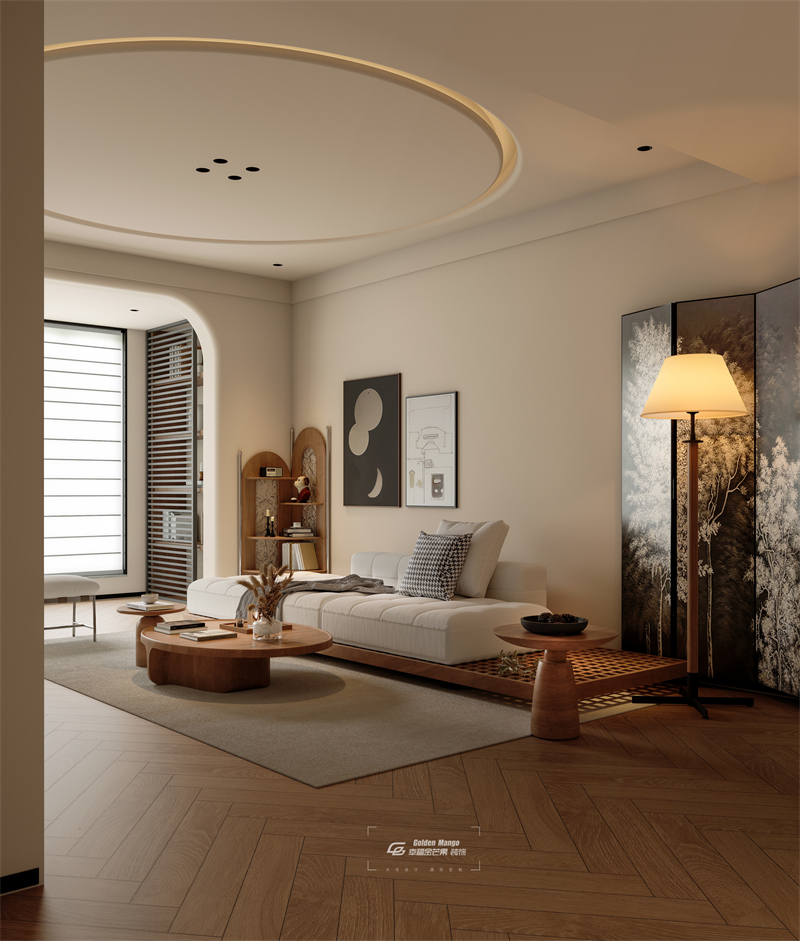 空間以淺色調為主,搭配木質元素,營造出溫馨自然的氛圍。家具造型簡潔,線條流暢,如圓潤的茶幾、簡約的沙發,盡顯舒適與時尚。