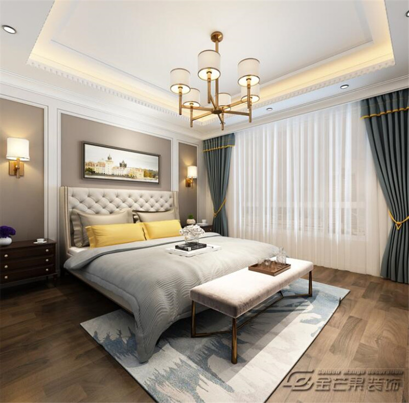 主臥的床頭背景色選擇了更加溫馨的卡其色與地板的顏色相互襯托,再加上偏歐式的燈具和床品,整體給人的感覺就是大氣而又溫馨