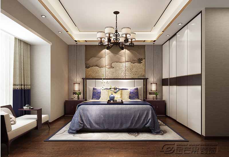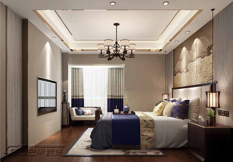 臥室運用暖色調的墻布做裝飾,床品素雅色調與窗簾呼應,形成視覺上的整體性。床頭吊燈色調清雅,與山水畫碰撞,燈帶線條與床頭宛如一體。局部一抹藍色,打破厚重點綴出活力。
