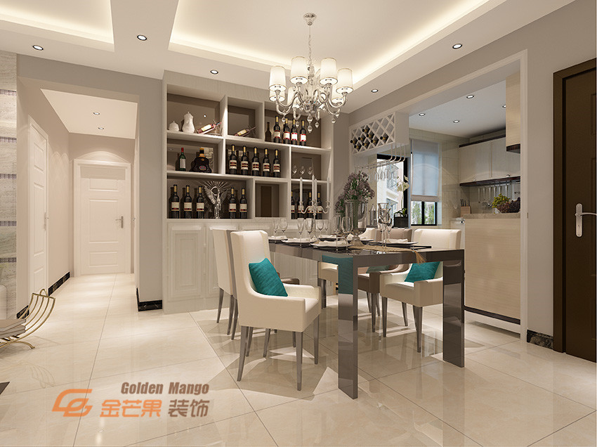 餐廳的四周以白色簡單線條的家居為裝飾起來,一切從功能出發,沒有多余的裝飾,顯得整體空間潔凈而敞亮,一種簡潔明快之感。頂部一個簡單的石膏線條加筒燈的搭配,很好的達到了上下兩個空間的映襯效果。
