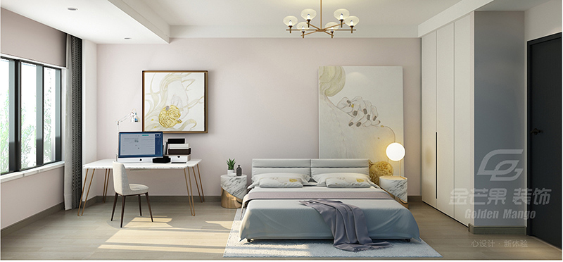 這兩個臥室在設(shè)計布局上有異曲同工之處,第一眼感覺就是女孩子的閨房,淡淡的粉色映入眼簾、整潔明亮。壁畫在此時則是文藝范十足的顯現(xiàn),大落地窗讓窗外的美景盡收眼底,增加通風(fēng)和采光。梳妝臺是精心準(zhǔn)備的開始。整體表現(xiàn)得溫馨,充滿少女心。