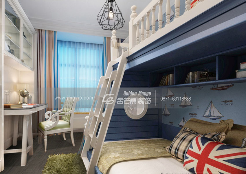 乳白色廊柱搭配上藍色是法式風格的一大體現(xiàn),清晰、美妙。高低床更加實用,巴洛克風格的椅子,淺藍色的窗簾,融入寧靜的海洋。