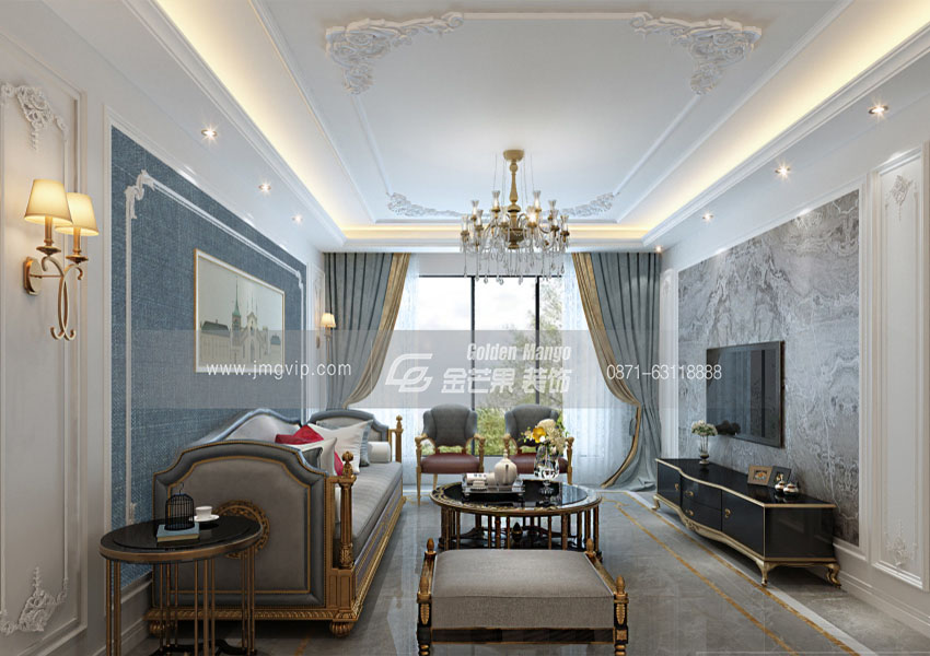 設(shè)計布局上沒有絲毫的掩飾,不論是大方的落地窗簾,還是頂上精美的雕花,亦或是晶瑩碧透的地磚等等,都在流露著豪華和優(yōu)雅。背景墻也和窗簾交相呼應(yīng)。雕刻精細的沙發(fā)和椅子,高貴典雅。