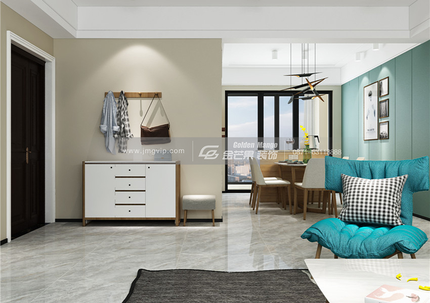 入戶搭配衣物掛鉤和和鞋柜,旁邊小凳子方便穿鞋換鞋,在整體上相互之間有很強的連通性。