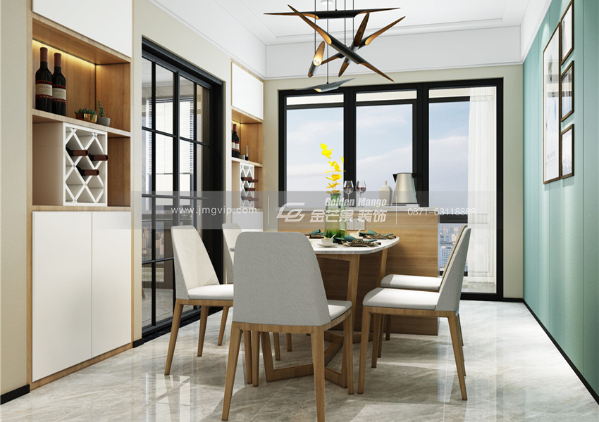 在餐廳的設(shè)計布局上融入吧臺的設(shè)計,空間使用上有很大的提升,加上坐感舒適的椅子,安心享用美食,吊燈依舊和客廳一樣的設(shè)計,融入了許多的線條元素。紅酒也使生活增添了幾分浪漫。
