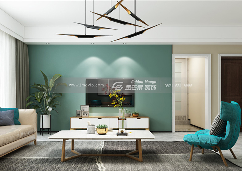 抹茶綠和綠植也是一對完美的搭配,獨特的吊燈設(shè)計有著很強的空間的穿透力。也是客廳的顏值擔(dān)當(dāng)。