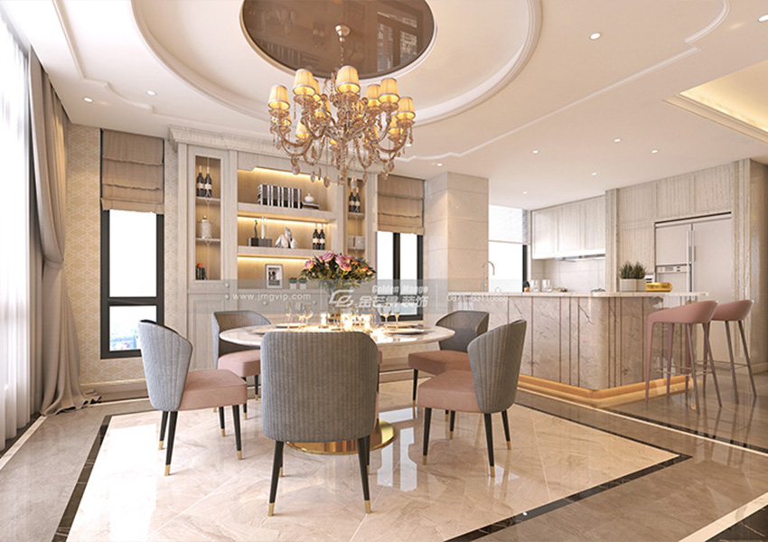 廚房、餐廳整體的布局更顯寬敞、大方。開放式的廚房加上大理石鑲邊的島臺,豪華的標(biāo)配。餐廳的燈具已然成為一件藝術(shù)品,頂被圓形嵌套包圍,搭配上圓形的餐桌,寓意團(tuán)團(tuán)圓圓,美美滿滿。地面方正形狀嵌套,代表著工工整整、和和諧諧。柜體上珍藏的美酒,也成為了生活的美妙之處。