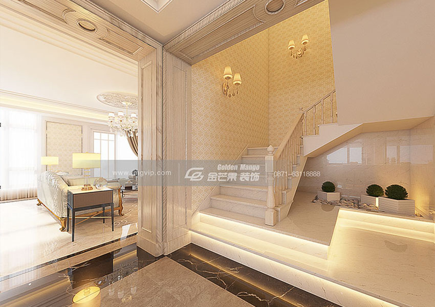 細(xì)節(jié)方面也恰到好處,樓梯安裝兩盞壁燈,邊角裝飾的燈帶顯得浪漫、撩人。金色打邊的桌子再次散發(fā)巴洛克氣息。優(yōu)雅的線條穿透著整體。