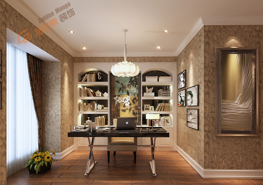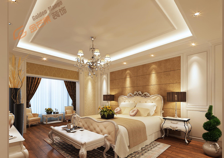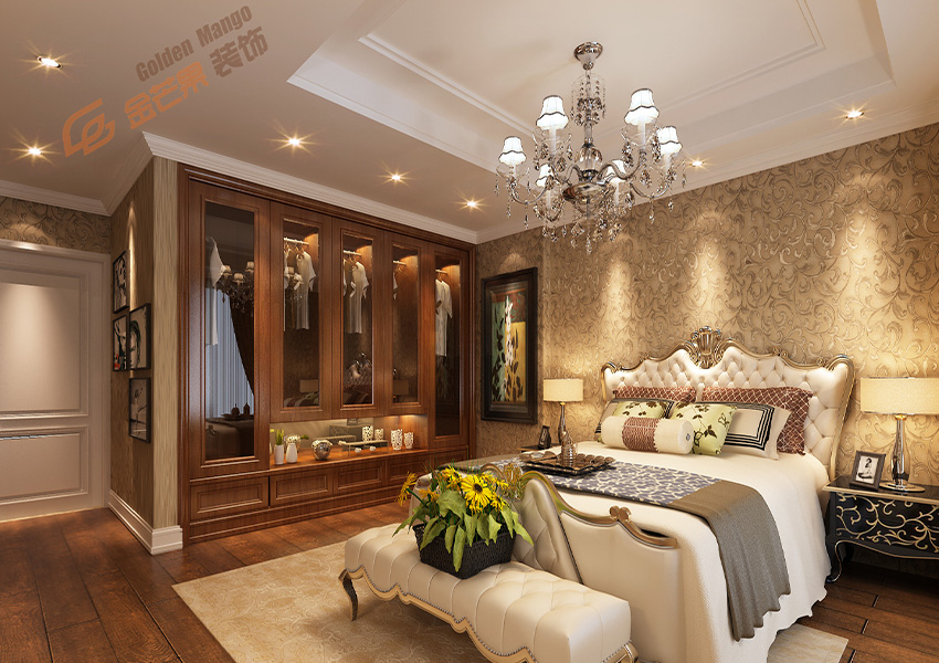 酒紅色木質(zhì)地板,歷史的味道傾瀉而出,金色背景和燈光的渲染,高貴的氣息顯露無疑。凹凸有致的床頭顯得質(zhì)感十足,酒紅色的柜體,洋氣大方,吊燈有著獨特的風味。此時,好像向日葵已成為基本的搭配。