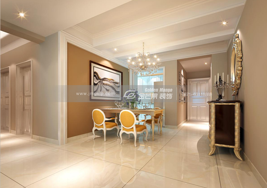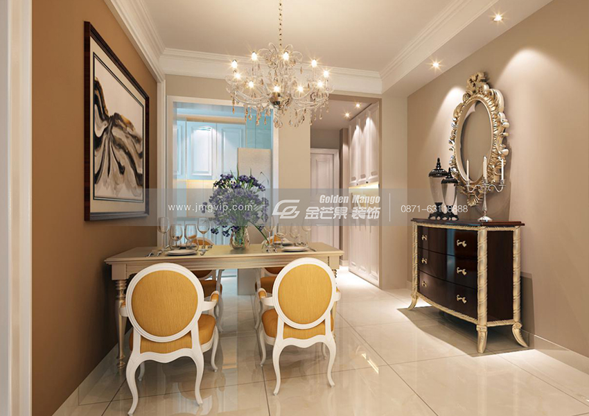 吊燈搭配上射燈,星星點(diǎn)點(diǎn),浪漫十足。精美的柜體、鏡子、餐桌運(yùn)用了巴洛克風(fēng)格,頓時(shí)高級(jí)感顯露。加上地中海風(fēng)格的椅子,奢華、優(yōu)雅聚于一身。狹長的走道保障了臥室的私密性。一體白色裝點(diǎn)廚房,干凈無瑕。
