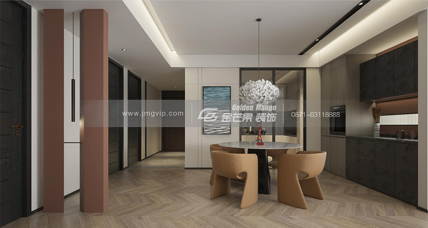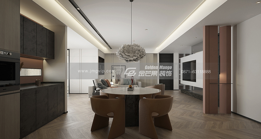 磚紅色和梨木色相搭配,意境十足??蛷d、餐廳、書房的布局,空間感覺更加強烈??蛷d面積寬大的地毯也保證了舒適性。頂上星星點點的射燈,加上燈帶的設(shè)計顯得空間上更具有穿透力。