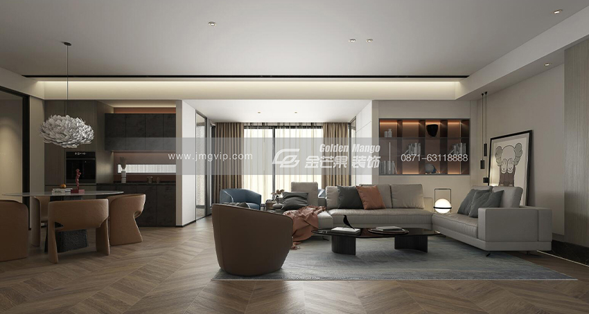 以電視背景墻巧妙隔開后面的書房、工作區(qū),淺色系的軟裝家具,也能讓浮躁的心,沉靜不少。地板拼接成紋理豐富的形狀。舍棄了吊燈、吸頂燈等主燈設(shè)計,空間上更加的統(tǒng)一、視覺更加的寬敞,燈光上顯得柔和。
