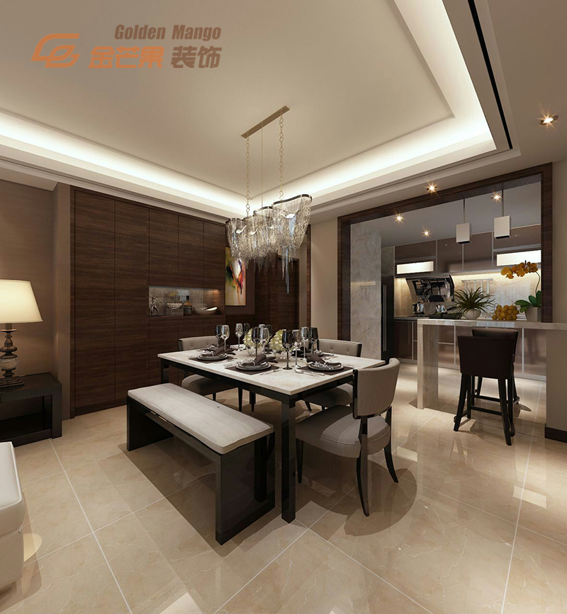 中式風格的沙發,咖啡色的背景墻。巨大的回字形燈帶為整體光照貢獻著力量,兩種風格地磚相互搭配,中式風格的茶幾。客廳和餐廳相互聯系,使用上有更好的便利性。透亮的吊燈,墻面以酒紅色的木質板材拼接。